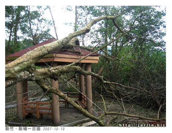 好大的一棵樹剛好倒在涼亭上