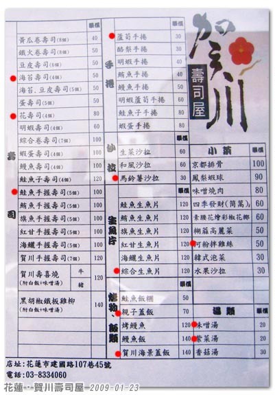 今天我們四個人總共吃了850圓,菜單上有紅點的就是我們點的菜。