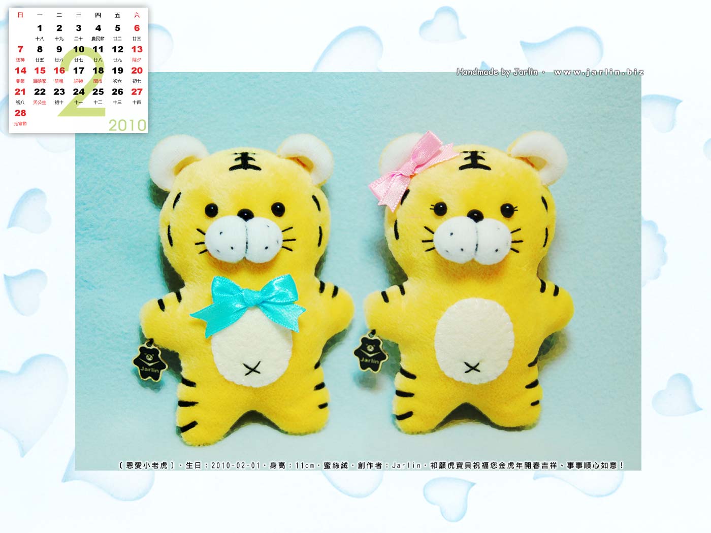 轉眼又到了2010年的二月份,在農曆年前Jarlin趕緊將一直想要完成的小老虎娃娃們做出來了!鮮黃色的小老虎搭配著Jarlin 一針一線手工繡上的黑色條紋,讓印象中很兇猛的老虎也有可愛的面貌!