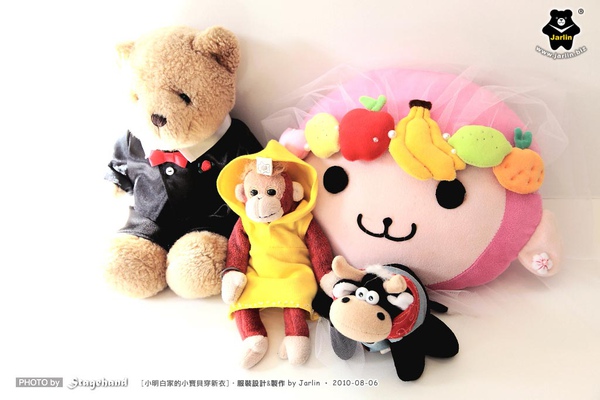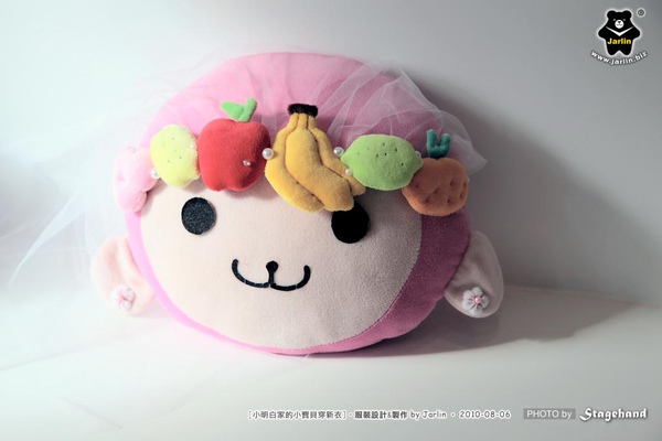 因為小明白跟太座才剛結婚,而且這次幫小傢伙們做衣服好像也是為了要拍婚紗照片,所以Jarlin阿姨幫拼拼想了水果串頭紗,我想小猴子一定會超愛這樣可口的頭紗。