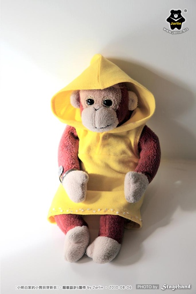 因為阿猴的身體軟趴趴地,Jarlin幫他設計了香蕉色的創意天使袍,有大大的帽子,不帶帽子垂下來時也是另一種可愛,還有裙擺的一圈亮亮小珠珠,以及在背後很低調的一個小天使翅膀。