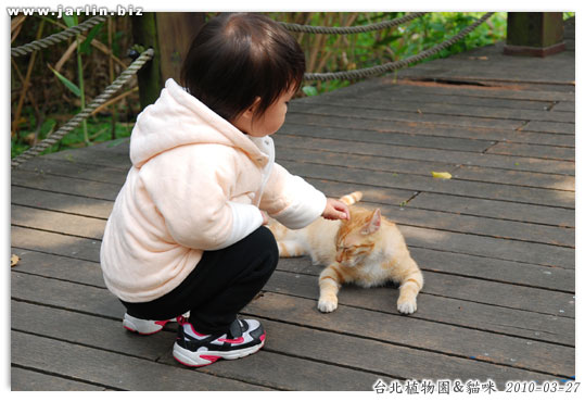 小妹妹終於伸出手摸小喵喵~ 小貓也很乖地讓她摸。