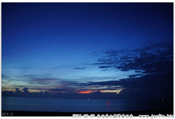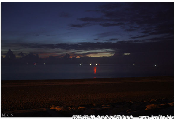 早上3:40起床,路上買了便利商店的熱鮮奶兩杯後直奔七星潭。在機場邊的停車場停妥車後,剛開始只見一兩個像是凌晨起來拾荒的長者,就沒看到其他的旅客或者看似特地前來看日出的人。也不知道太陽會從哪個地方升起?還是整片漆黑的海邊,除了海上作業的船隻漁火就是天上的星星,還有我們身後的一些路燈,也因為有點光害所以看到的星星沒有非常多。