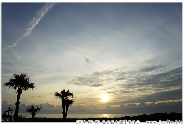 往後退到草坪後頭,加入椰子樹的身影。一直到升得很高的時候太陽才掙脫了雲的遮蔽,早就是讓人無法直視的金黃火球,這時也才早上五點多而已。