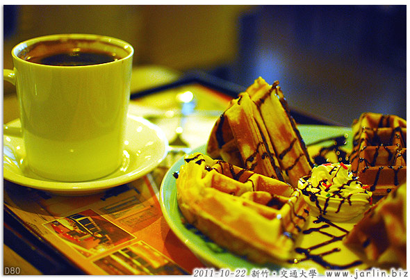 兩點多的午後,直想找個可以喝下午茶休息的位置,藝文中心的門口就有家小店可以用餐,我點了這一套美式咖啡+巧克力鬆餅,不到90元,這應該是在學校裡才有的價位吧?