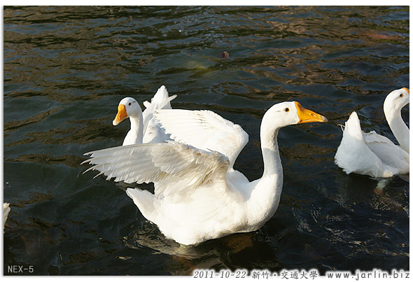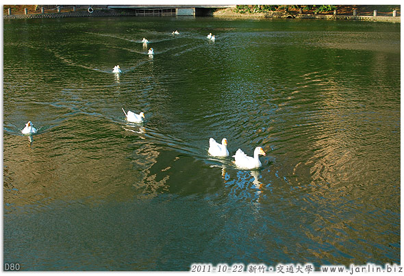 竹湖中的鵝群知道有食物可以吃,很迅速地游了過來。(旁邊有父母帶著小孩拿土司要餵牠們)