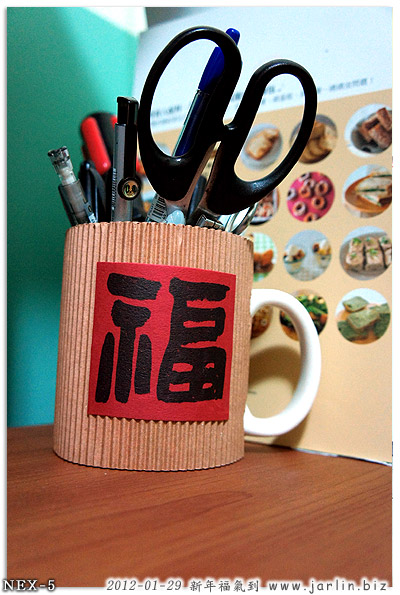 電腦桌上的筆筒,是用一個贈品馬克杯當現成筆筒,因為圖案實在不太喜歡,用了瓦愣紙包起來,再貼上紅底福字,這樣也挺應景的!其實這瓦橫紙跟福字原本是一本筆記書的外包裝,就直接拿來利用了!