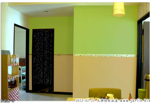 餐廳的這面牆我一直想幫她粉刷上美麗的顏色。中間的腰帶,我也想過好多個版本,曾經還想過買馬賽克小瓷磚來貼。經過"稍稍"研究一下,發現" 代誌毋是憨人想ㄟ加擬甘單..." 貼瓷磚還得動用到水泥,或者其他專業的粘著劑,看到一堆很陌生的名詞,看起來很麻煩...於是很乾脆地放棄!