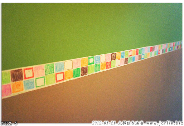 彩色格子塗畫好後,牆角明顯不平處也稍微做了補土的處理,就這個狀態不知道擱了好幾十天。