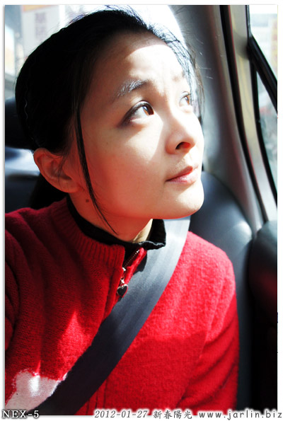 這是前天出門拜訪親友時,坐在車子後座見到久違陽光時自拍的照片。很喜歡這張照片的感覺。
