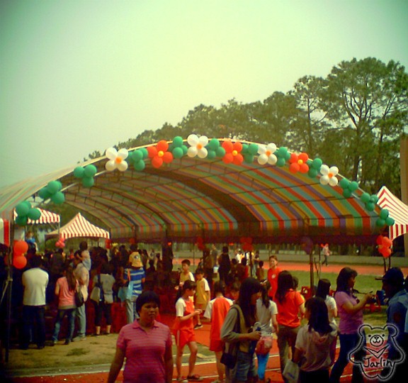 操場上還搭起了鮮豔的彩虹棚子,像是要吃大辦桌一樣的熱鬧