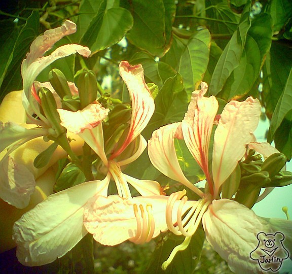 有木造涼亭也有讓植物攀爬的木架,靠小河旁有一整條小步道,伴著整排花正盛開的羊蹄甲