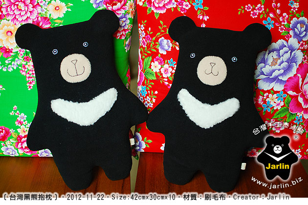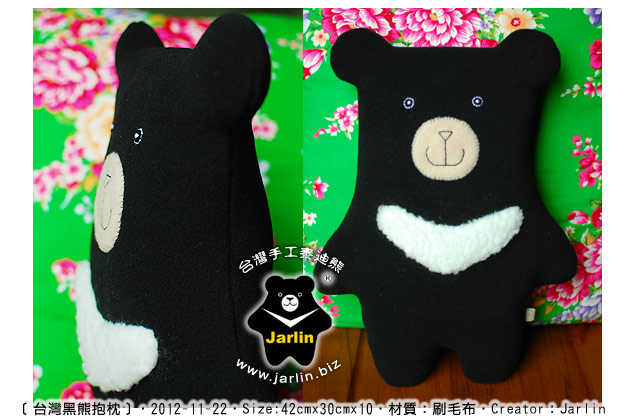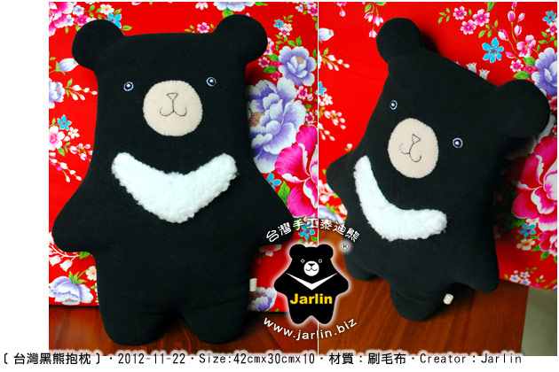 笑容比較憨厚的 [台灣黑熊先生抱枕],一件990元,手工作品皆無現貨,歡迎 來信預購