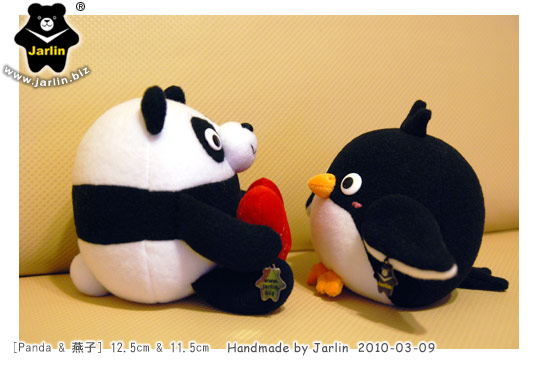 Panda在公司同仁的聚餐上捧了一束花上面放了這對特別定製的熊貓與燕子的布偶