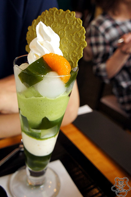 聖代中的果凍和冰淇淋,使用了大量的宇治抹茶,在淋上濃稠的蜜汁。最後加上紅豆等日式風味的食材。