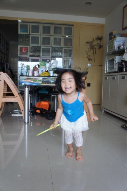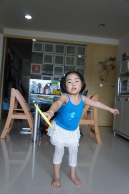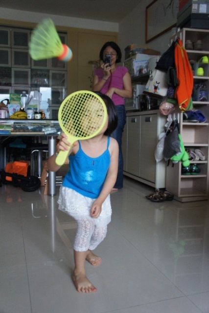 享用pizza時虹虹還用家裡的製汽水機加上維他命發泡錠做了碳酸飲料做搭配,在愉快的午餐後妹妹小雅則拿著軟式的塑膠羽毛球讓我們丟給她揮拍,剛開始還不太熟練,但不用多久就可以玩得很好了~命中率越來越高!