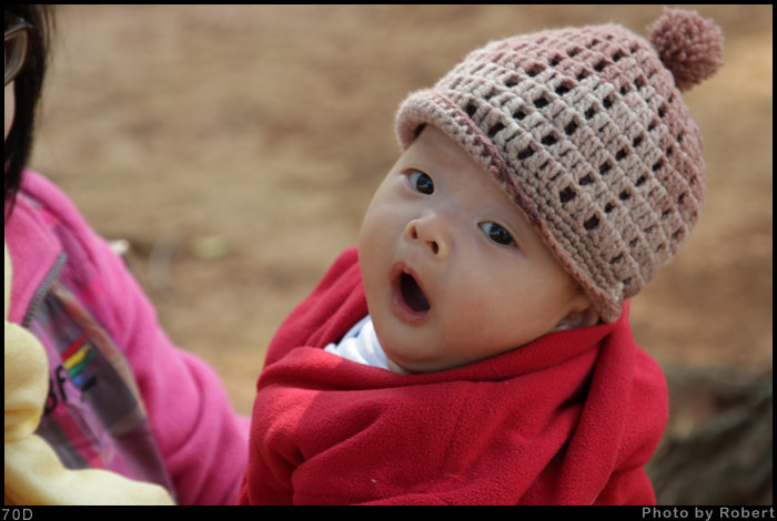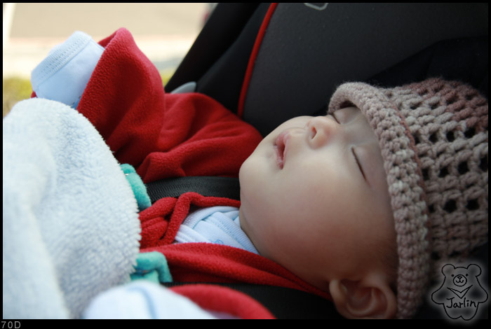 小范糰的外婆為他鈎的第一頂毛線帽(帽子上的洞洞有點太大,所以裏頭搭了深咖啡色的內裡,才不會太通風了)。這頂帽子的尺寸大了點,剛生出來時的他還沒辦法戴,我媽媽又幫他鈎了另一頂比較小的,小的那頂戴沒幾次就太緊了,現在戴這頂原本太大的就已經剛好了。