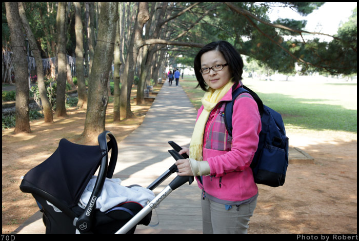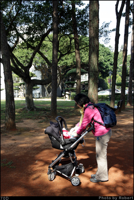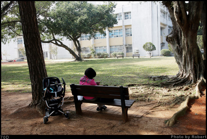 這個構圖是我要求的,要拍到遠方的大樹、綠地、推車、坐在長椅上的哺乳背影。