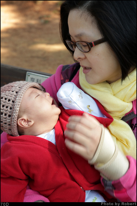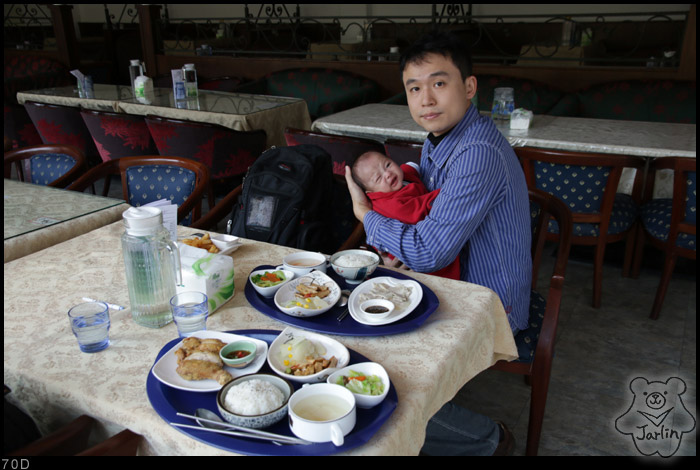 果然推車一停下來,小范糰就開始哭哭討抱了,只好抱著他用餐了。Robert先抱著他,單手不太方便地用餐,我則儘量加快速度地吃完餐點再抱小范糰過來。帶著小寶寶果真要吃一頓悠閒的飯都難啊!這兩個多月在家裡也常常是這樣的。