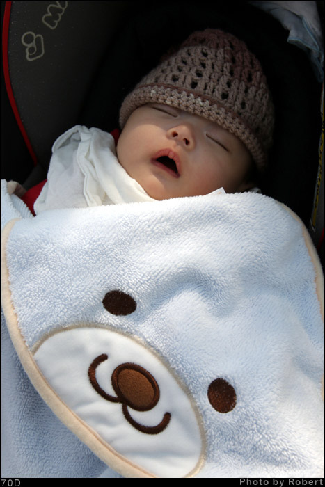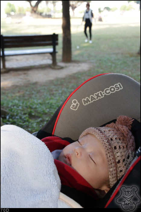 冬天裡接近中午的陽光,曬起來很舒服。小范糰喜歡坐在行進的推車上,車子一停下來就不開心,搭汽車時也是這樣。這天從車子下來開始推的這段路,他都一直舒服地睡著覺,不過他現在每天上午也是都在睡覺的狀態中,中間可能會要一次喝奶,一直到中午左右才會真正醒來。