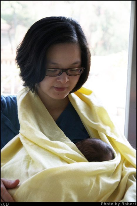感謝好友贈與的哺乳衣,舒適好穿。這件粉黃色的寬版羊毛薄圍巾也是另一位好友多年前給我的,出門時抓來圍著脖子禦寒用,攤開掛著也正好在哺乳時可以作遮掩,同時包住寶寶保暖。