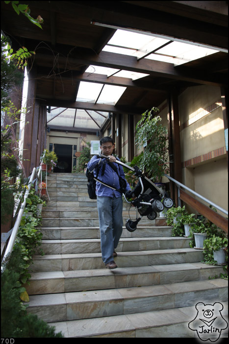 餐廳的樓梯,我先下樓等Robert把小范糰坐在上頭的提籃汽座的部分提下來,他再上去把手推車抬下來。