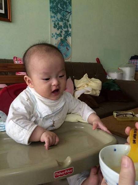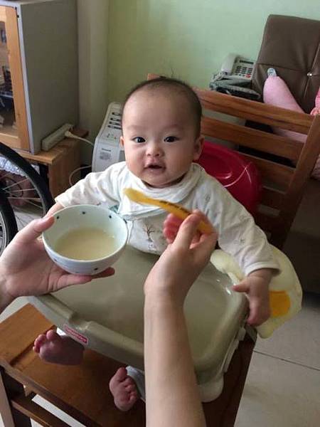 今天小范糰的外公外婆來看乖孫,媽媽看我們買了寶寶餐椅,要我趕快給小范糰坐著吃米糊。