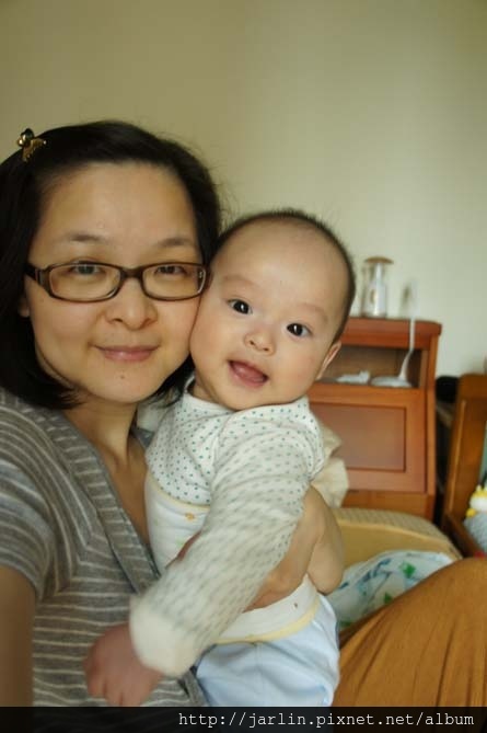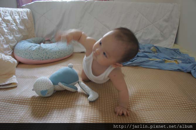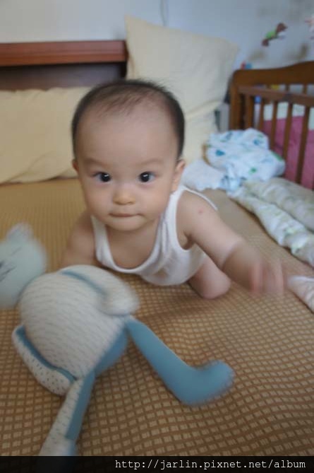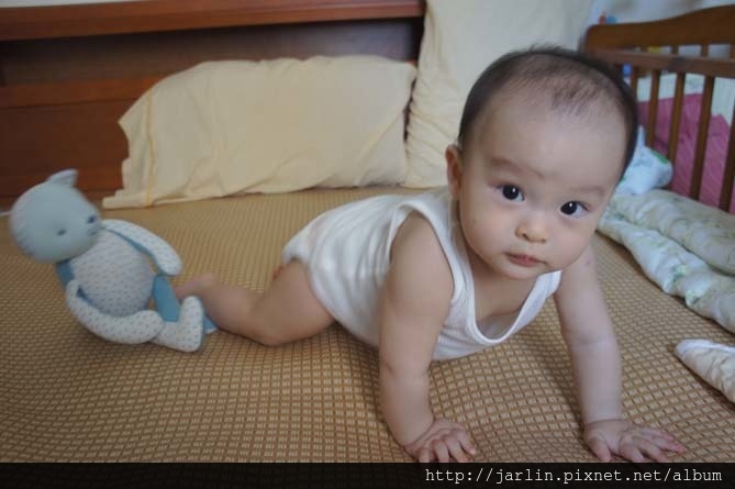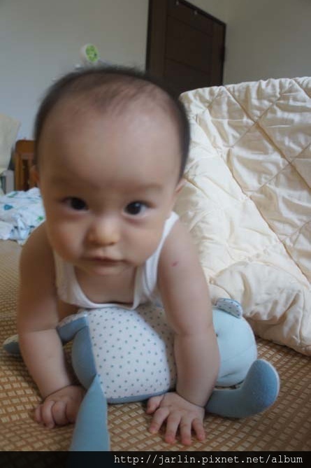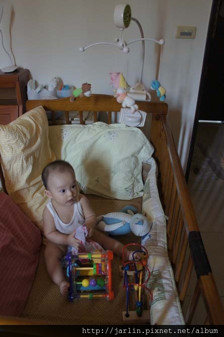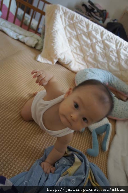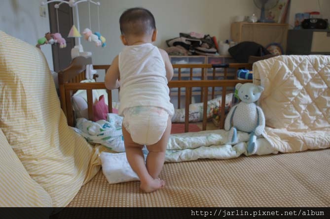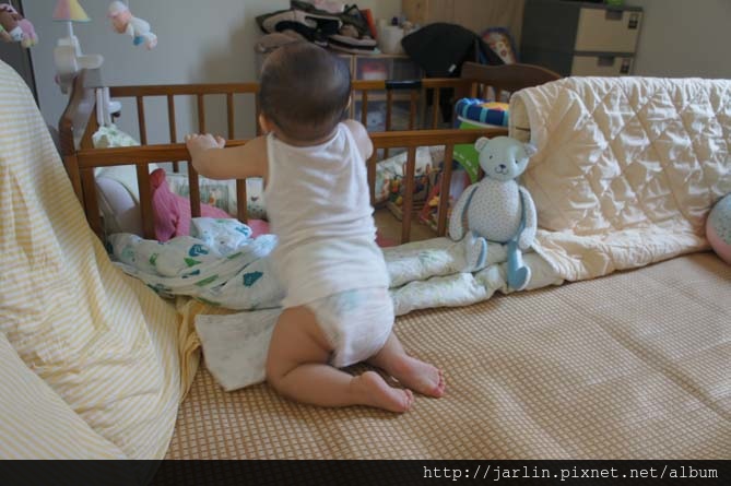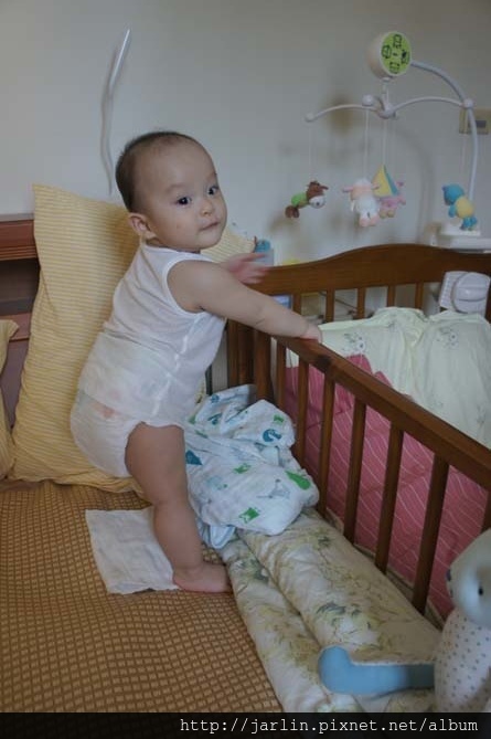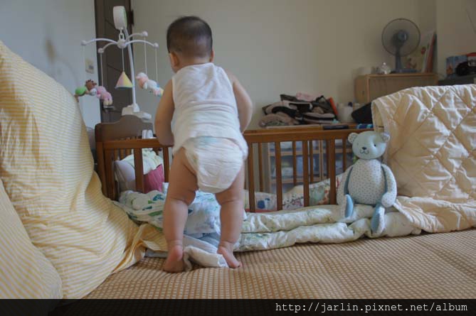 那時候他好愛這樣把腳跨在嬰兒床的欄杆上啊! 而且總是整個人在原地繞圈圈,當時還不會爬行的寶寶現在已經快滿九個月,不僅是滿地亂爬還最愛衝去找電扇,看到甚麼都想當支撐讓身體站立起來,媽媽我整天都要把他看緊緊啊!