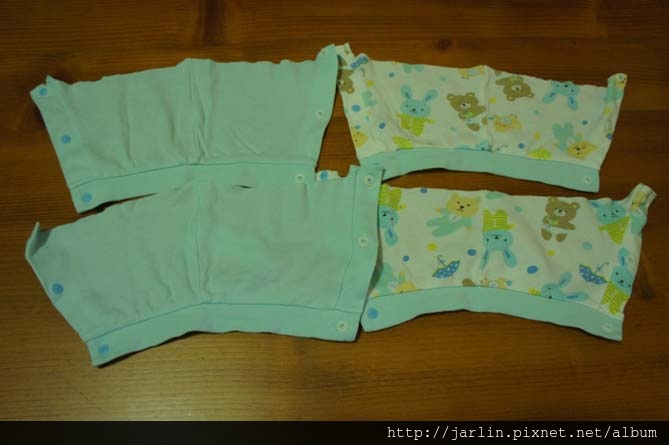 這些是從另外兩件連身服剪下來的褲管,原本的新春款連身服是小范糰的阿公特別帶我們去買的,因為也有"第一次"的紀念價值,所以天氣熱後改掉褲管讓衣服變成小外套,剪下的布料也可以先拿來做小熊。這次熊熊用到的是素面淺藍色的部分,用來做熊熊的面部。