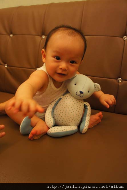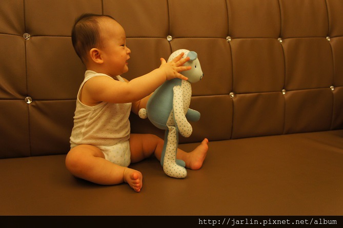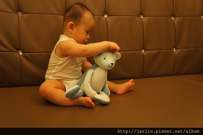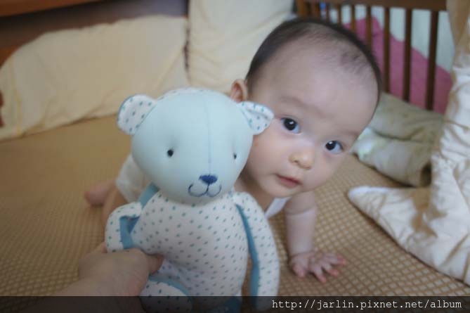 小熊的活動範圍在我們睡覺的房間,如果小范糰在大床或小床上玩或睡覺,我都讓熊熊在他身邊。這天我是為了要幫他們兩拍照,一直把熊熊放在寶寶身邊,但他一直不願意好好坐著讓我拍照,不管我怎麼擺,他就是一直不管小熊,很快速地往我爬過來。