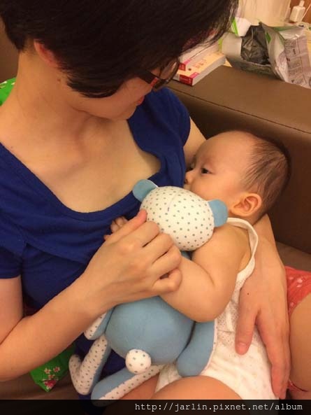 傍晚喝奶時,熊熊一起來湊熱鬧,讓他們培養一下感情,之後我每次若在床上餵奶就大概會這樣讓寶寶抱著小熊,讓他習慣熊熊陪他喝奶跟睡覺。