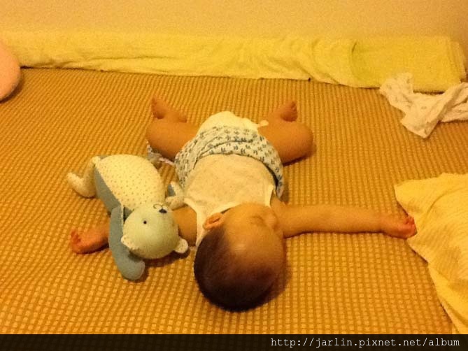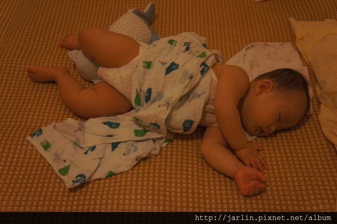 晚上寶寶都在九點多到十點多的時間先睡覺,我大概常摸到半夜一兩點才睡,偶爾進房看看寶寶睡得如何,這張照片中的熊熊已經被寶寶腿庫壓住了...