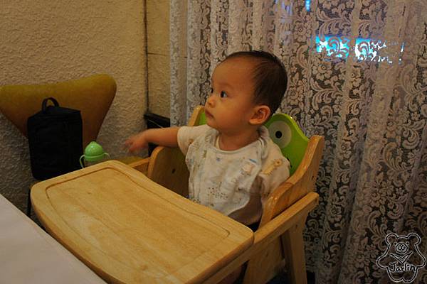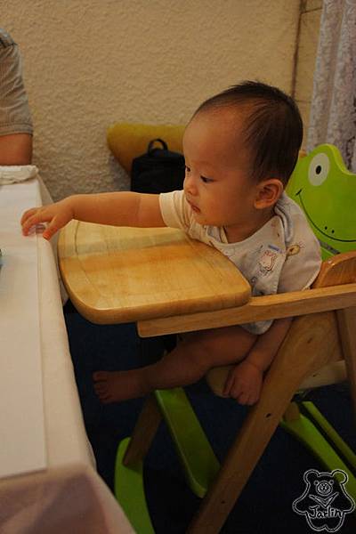 小范糰坐在青蛙造型的寶寶餐椅上。