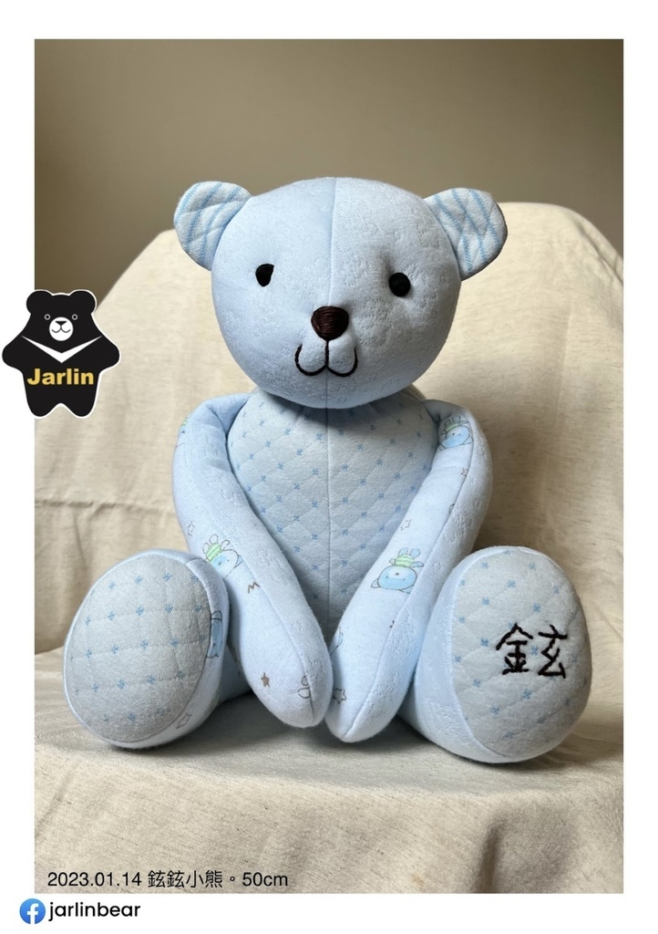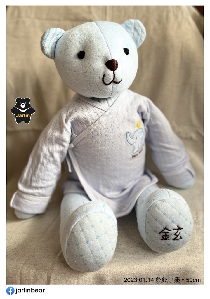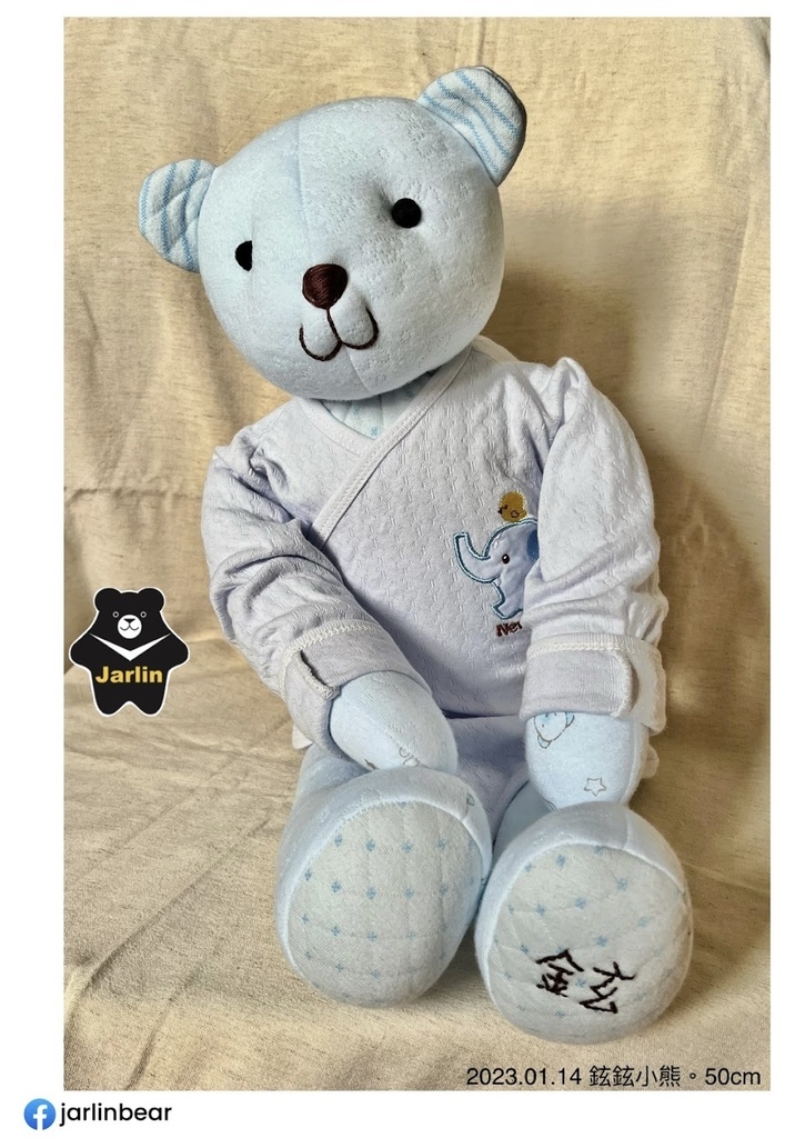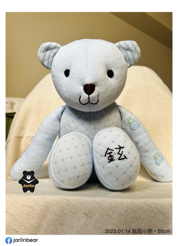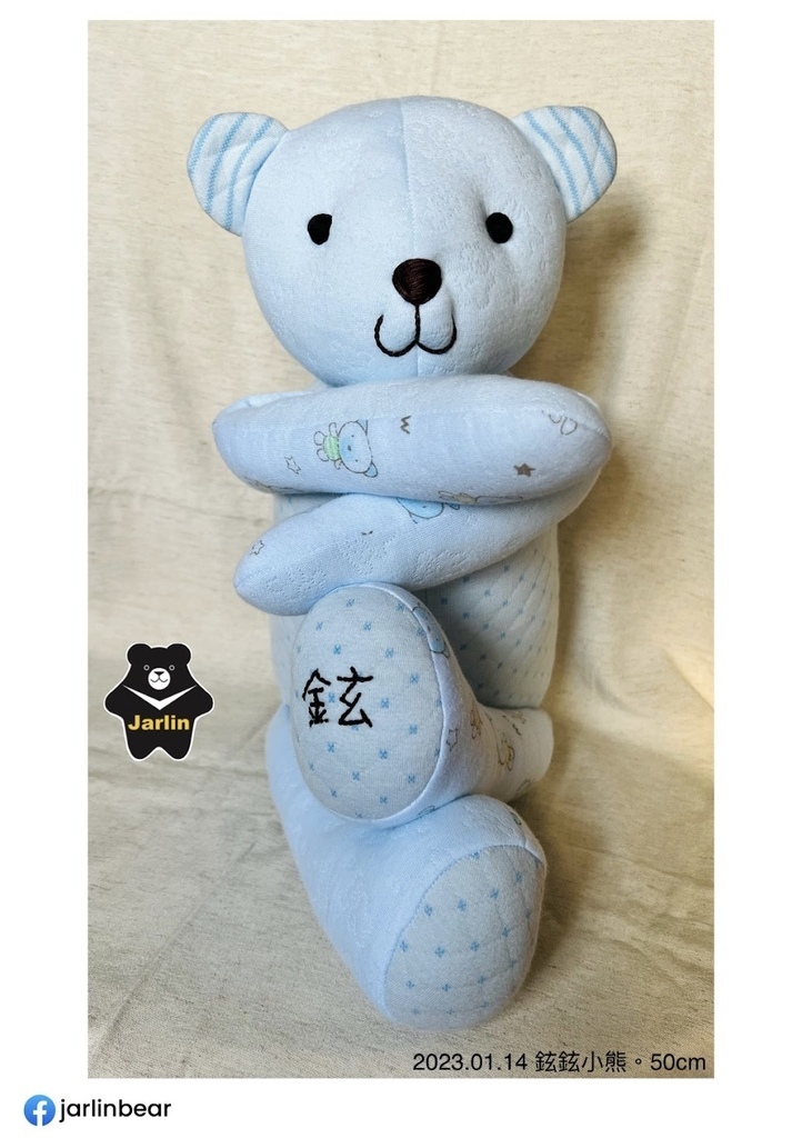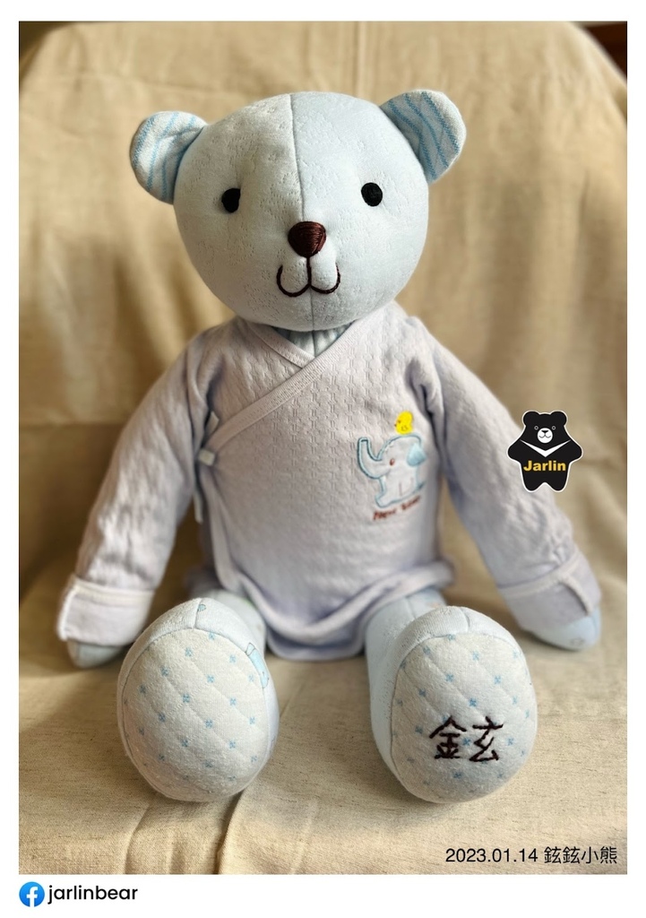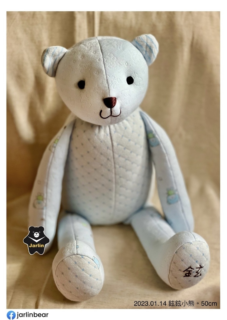 之前客人拿寶寶衣服請我做的熊熊或生肖娃娃大概多在30cm上下,這次因為弟妹拿了三件藍色系的衣服以及一件保暖毯子,在材料很充足的情況下我做了50cm的熊熊,還特地留下一件寶寶衣服讓熊熊穿上,以後要幫熊熊換裝也很方便,就拿差不多大時的衣服給熊熊穿就可以了!剛好三歲多的小孩慢慢地也要開始學習穿脫衣服,可以先用熊熊做練習。